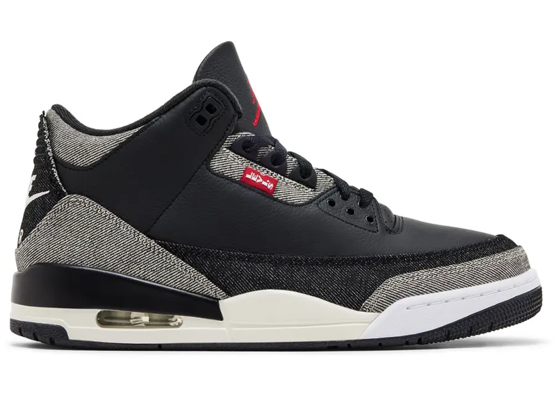 The Air Jordan 3 Retro Levis Black reimagines the timeless AJ3 through a rugged Denim and Black construction accented by Gym Red detailing. The denim upper adds texture and character, giving the silhouette a slightly worn in feel while preserving the signature shape that defines the Jordan 3. Red accents provide sharp contrast, emphasizing key design lines without overpowering the dark base.