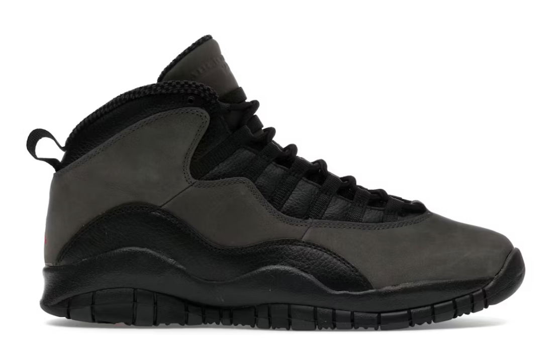 The Air Jordan 10 Retro Shadow (2025) returns as a masterclass in understated style. Dressed in charred grey, true red, and black, the colorway balances subtle tones with contrasting materials. The soft grey upper and black leather detailing create a clean, versatile look that has made this version a fan favorite since its debut.