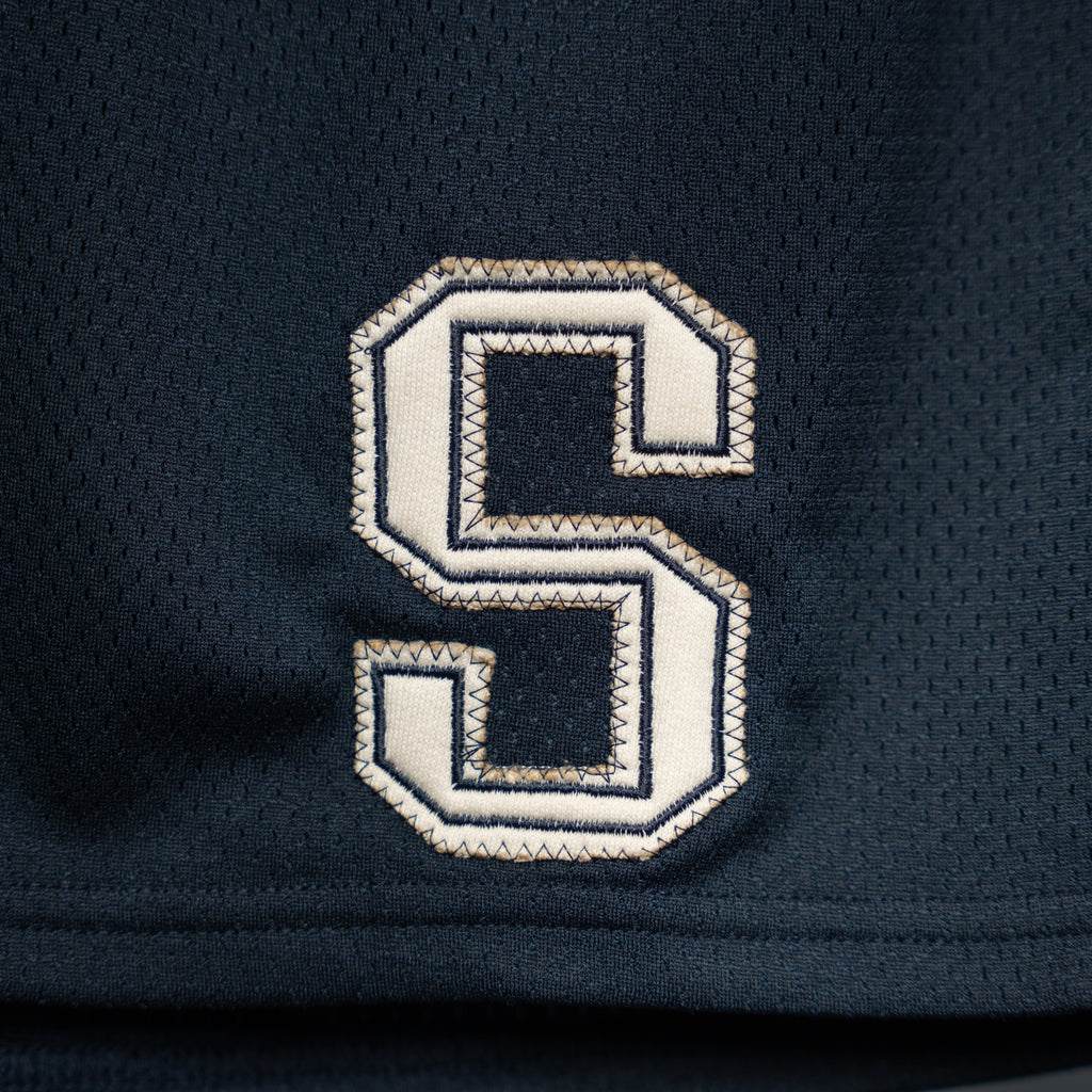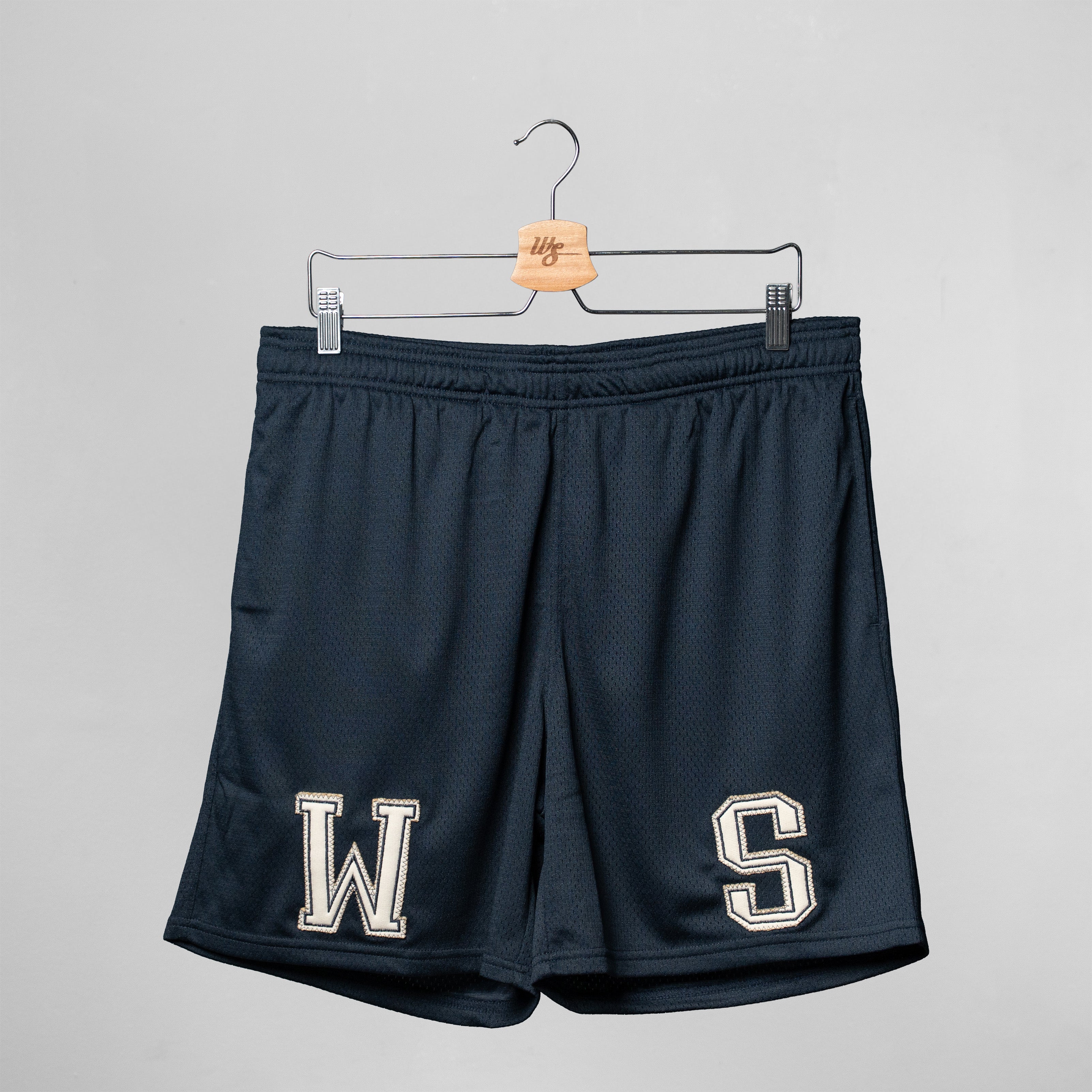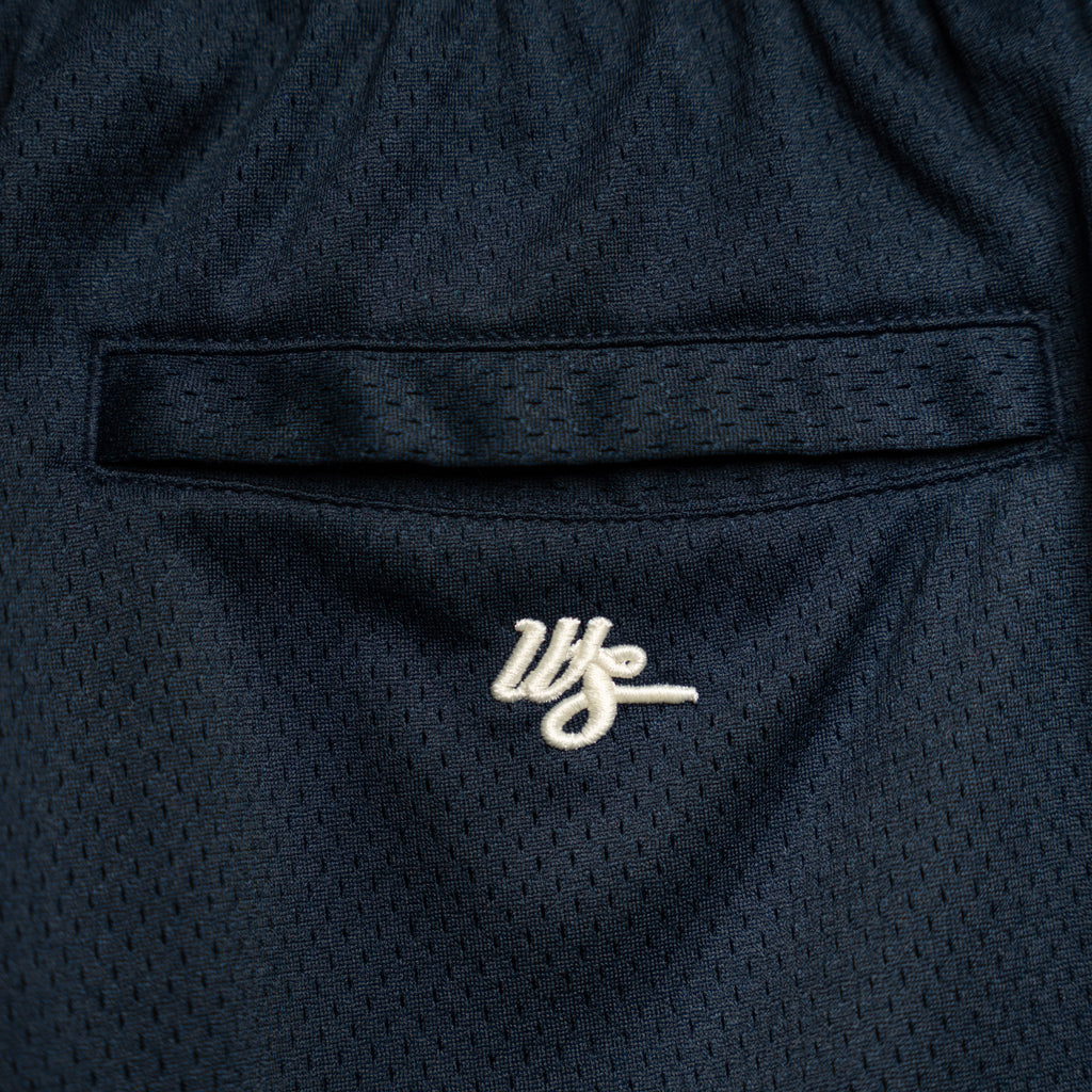 High-quality navy mesh shorts featuring light-cream appliqué W and S patches placed on each leg, they bring a classic varsity inspired detailing that speaks to Wilson’s Stuff craftsmanship and passion for sports.