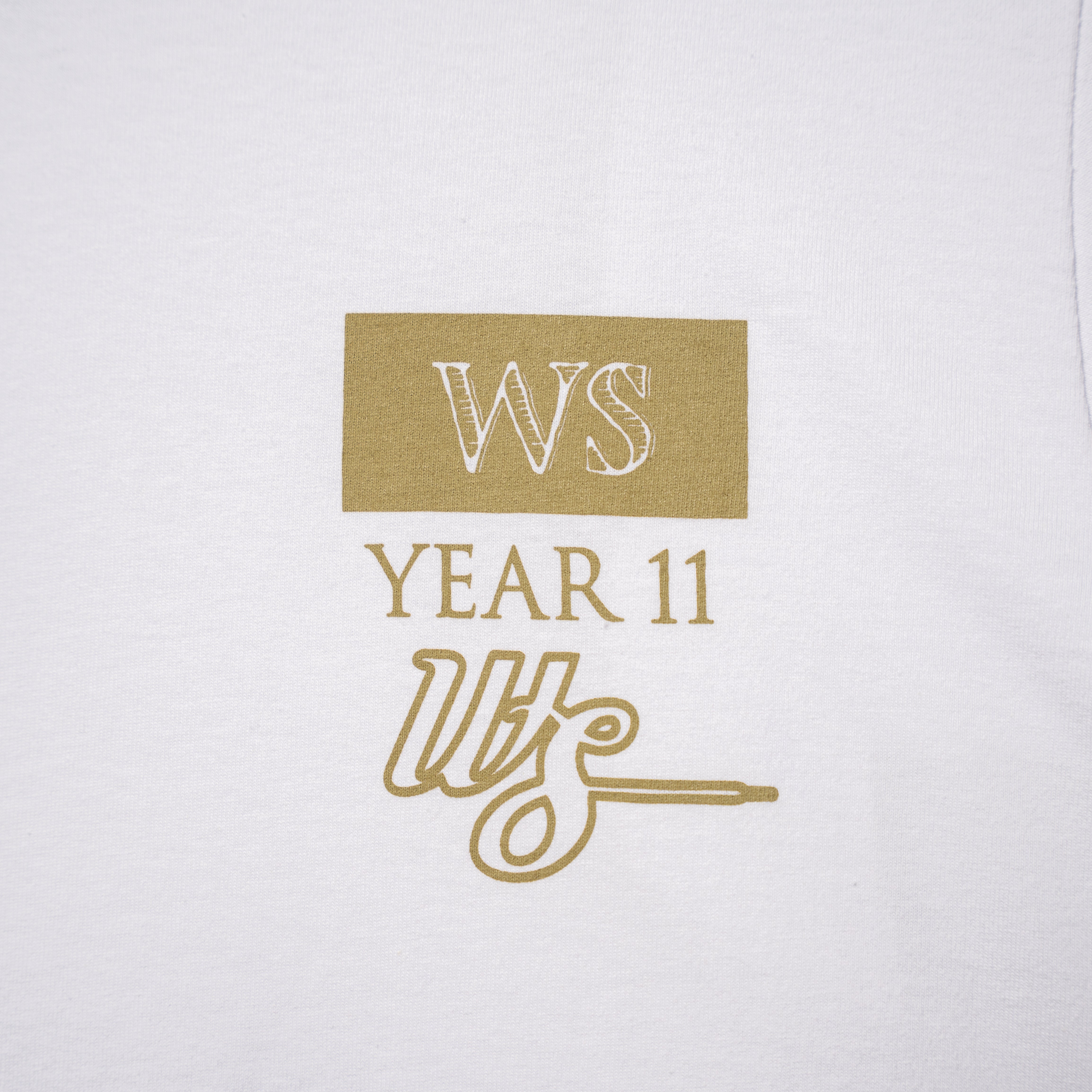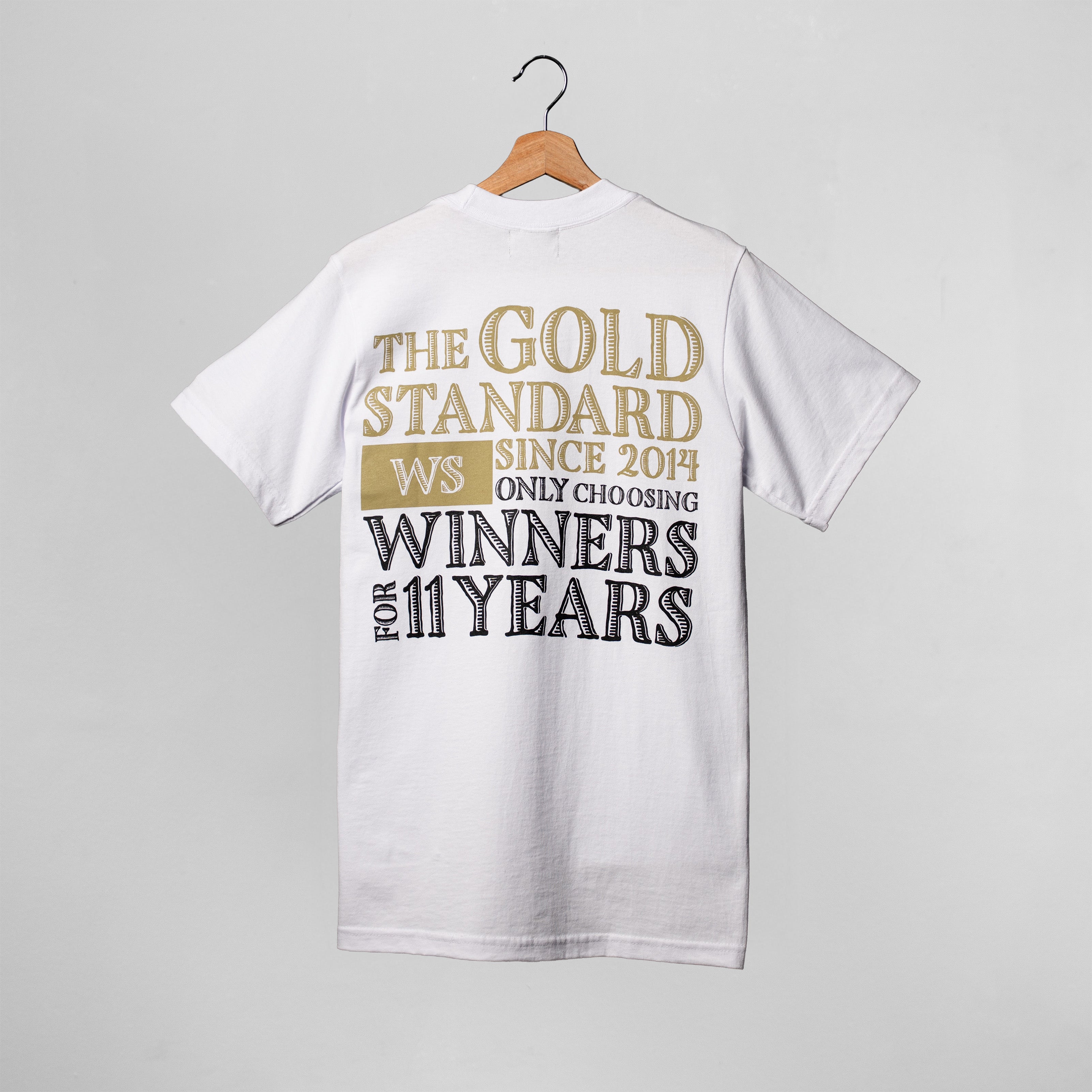 The front features a clean left-chest screen print, a subtle emblem marking the milestone.