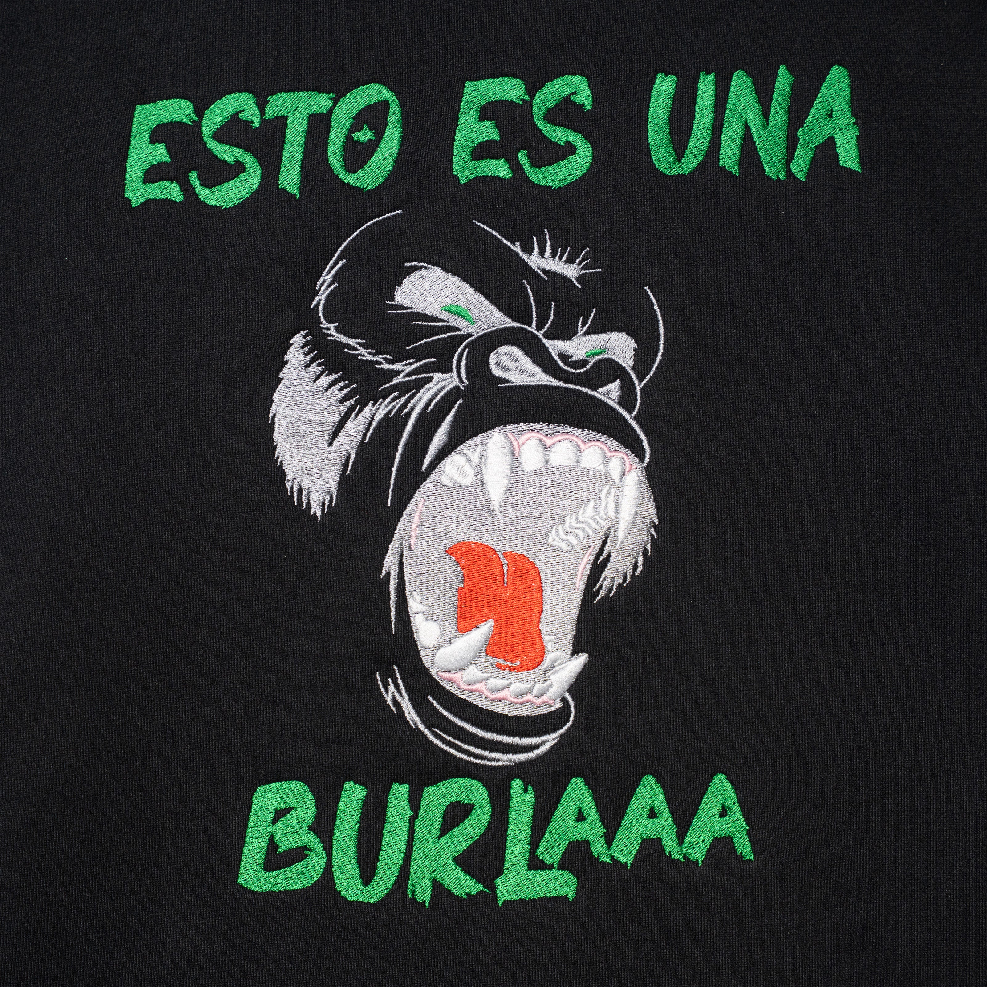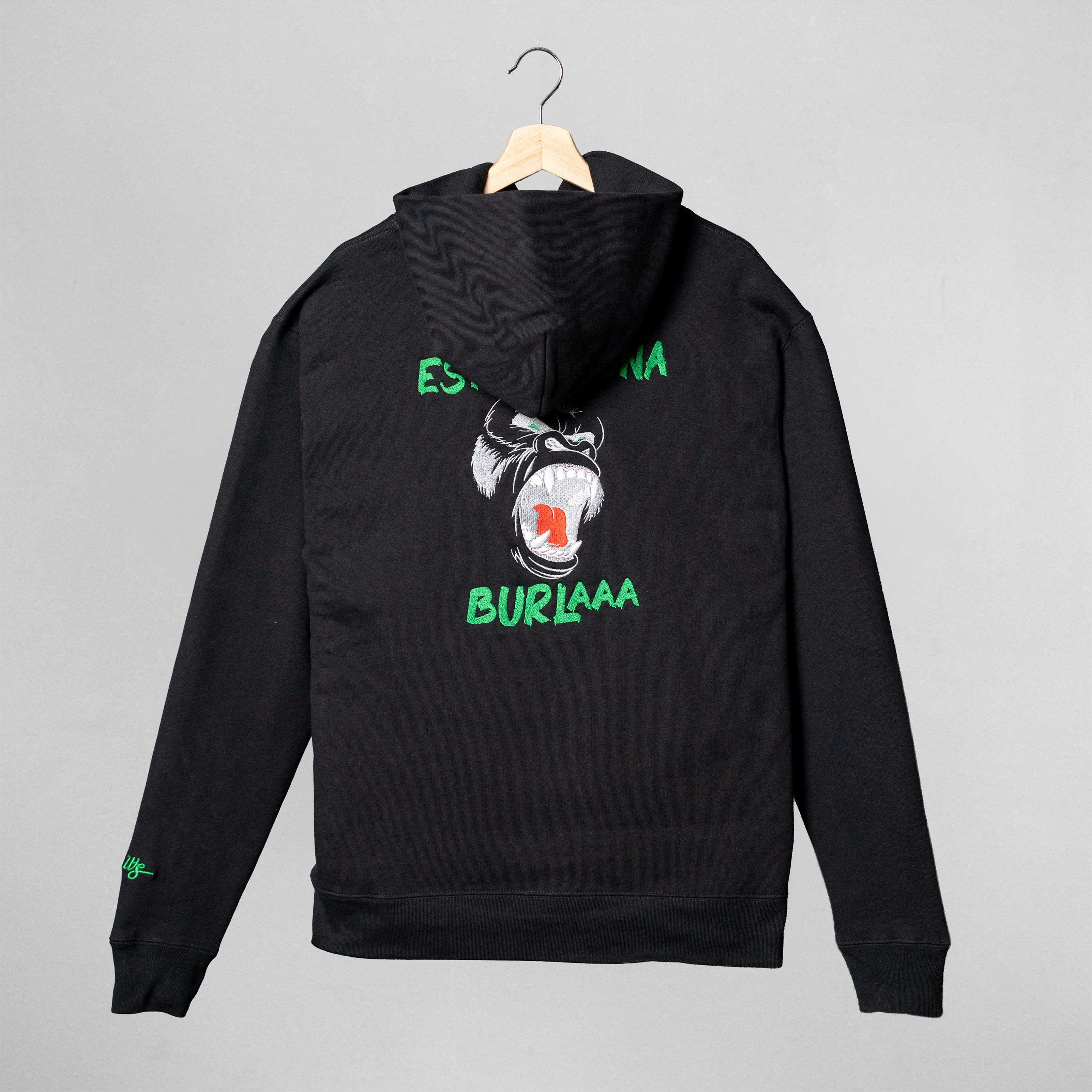 The Una Burla Hoodie features the fully embroidered back graphic that became synonymous with Michael Flores’ explosive rise following Casa De Alofoke 2. The bold green lettering and expressive illustration dominate the back panel, executed in high-density embroidery for depth and texture.