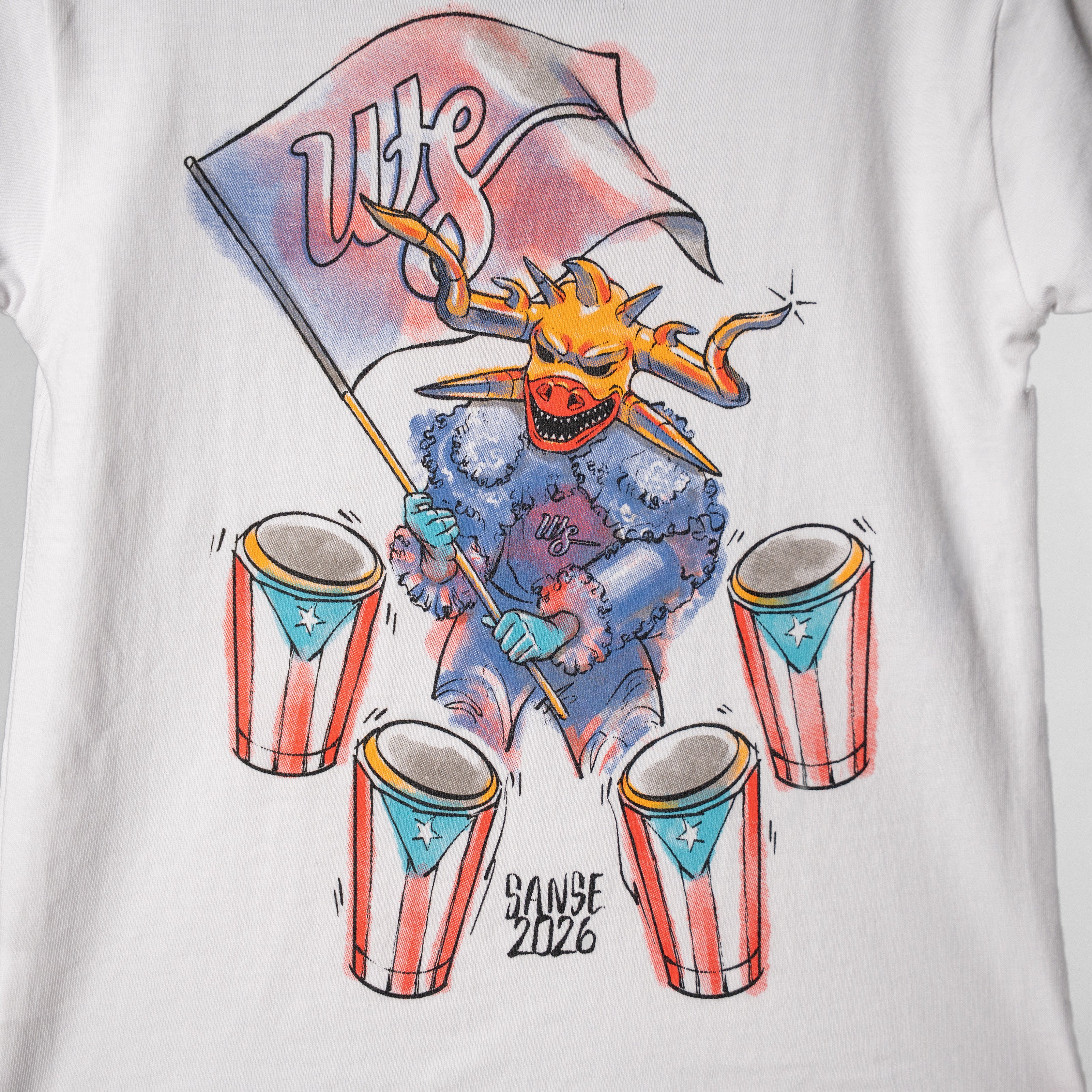 "Capturing the rhythm, color, and energy of Las Calles de San Sebastián. Rooted in Puerto Rican tradition and inspired by the cultural outfits seen in parades and bomba y plena performances, the design blends heritage with contemporary streetwear for a piece that stands out with intention and pride."