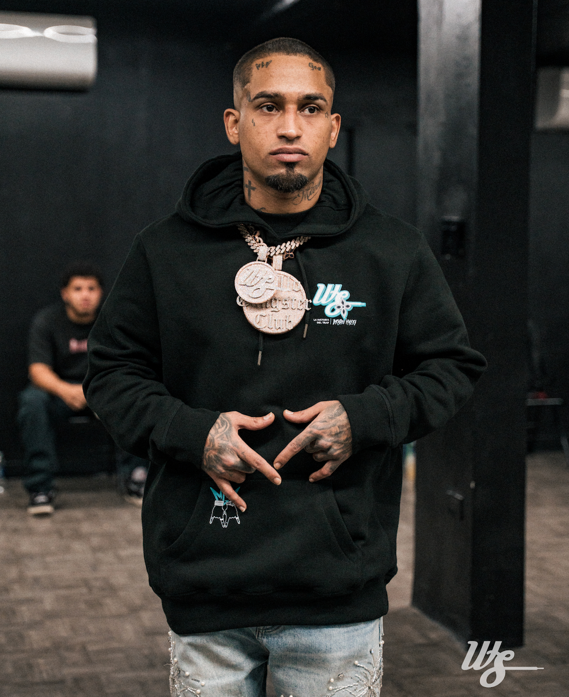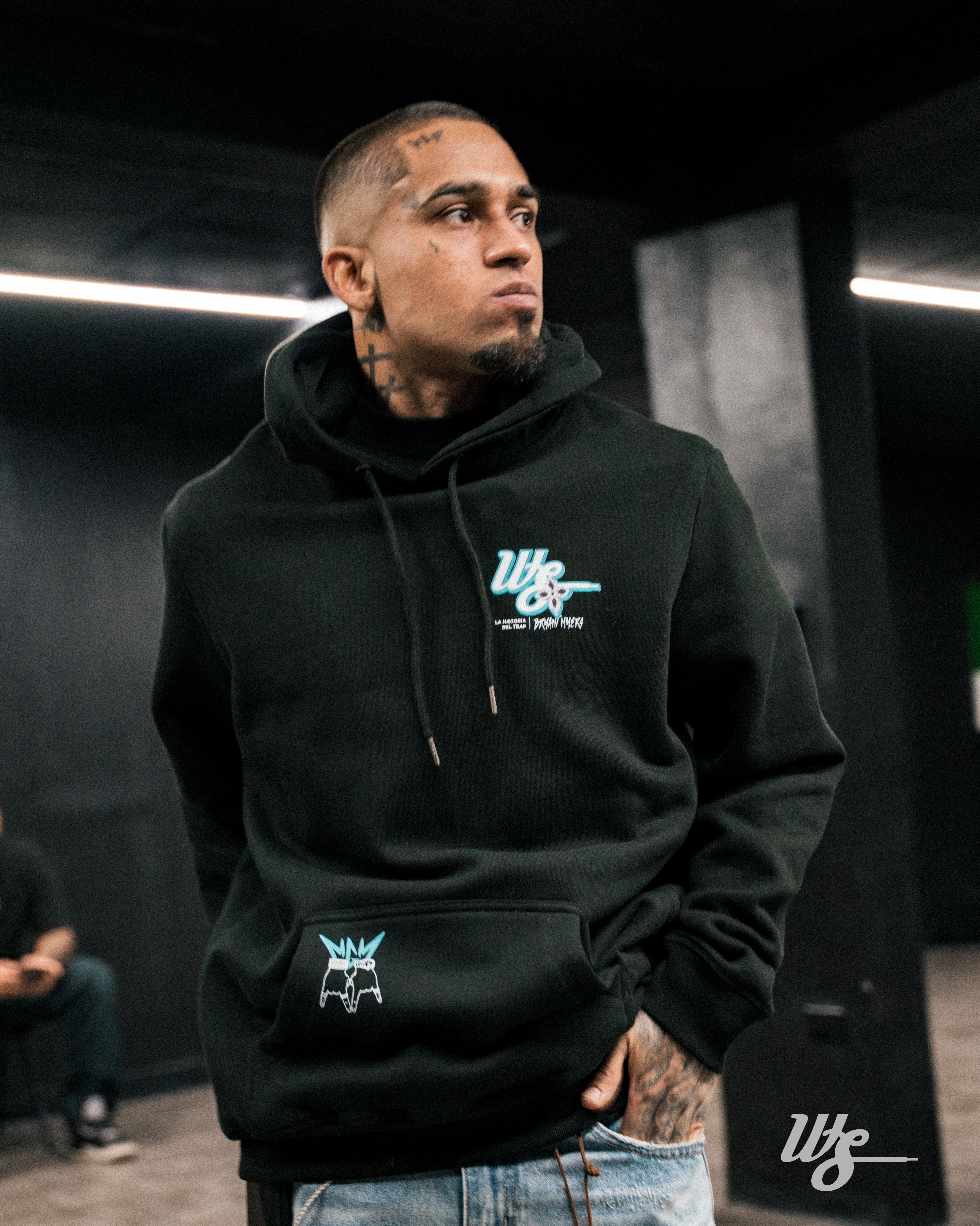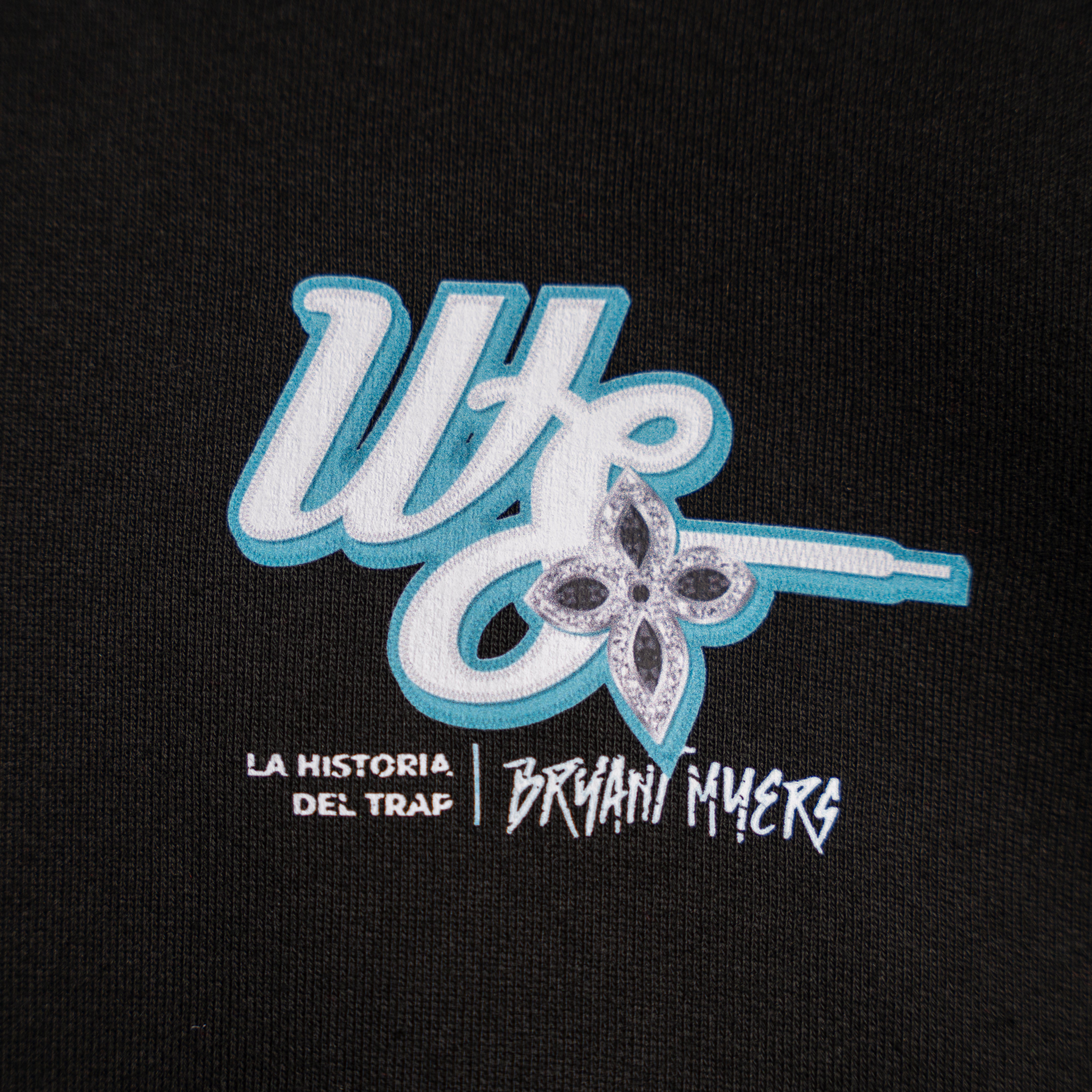 WS logo, designed using the same flower-shaped gemstone look inspired by Bryant Myers' custom chain. On the back, the artwork becomes the main focus: a floral-diamond chain wraps around an illustrated view of El Choliseo, creating a powerful frame that highlights the venue at the center of the collaboration. The design is completed with Bryant Myers' name in his distinctive distressed typography and a WS pendant graphic that closes the chain at the bottom. The result is a hoodie that feels iconic, collectible, and rooted in Puerto Rican trap culture.