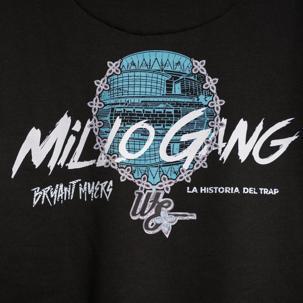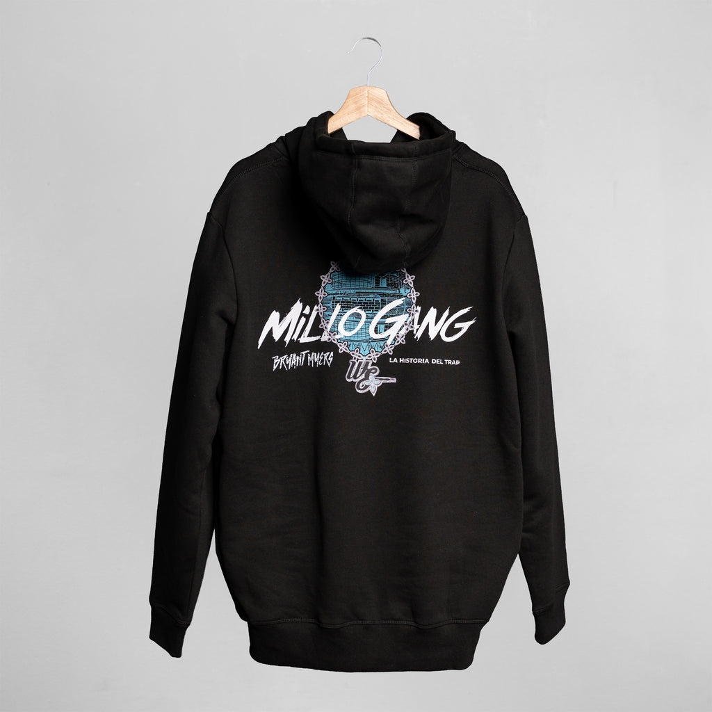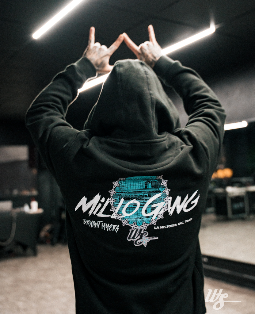 WS logo, designed using the same flower-shaped gemstone look inspired by Bryant Myers' custom chain. On the back, the artwork becomes the main focus: a floral-diamond chain wraps around an illustrated view of El Choliseo, creating a powerful frame that highlights the venue at the center of the collaboration. The design is completed with Bryant Myers' name in his distinctive distressed typography and a WS pendant graphic that closes the chain at the bottom. The result is a hoodie that feels iconic, collectible, and rooted in Puerto Rican trap culture.
