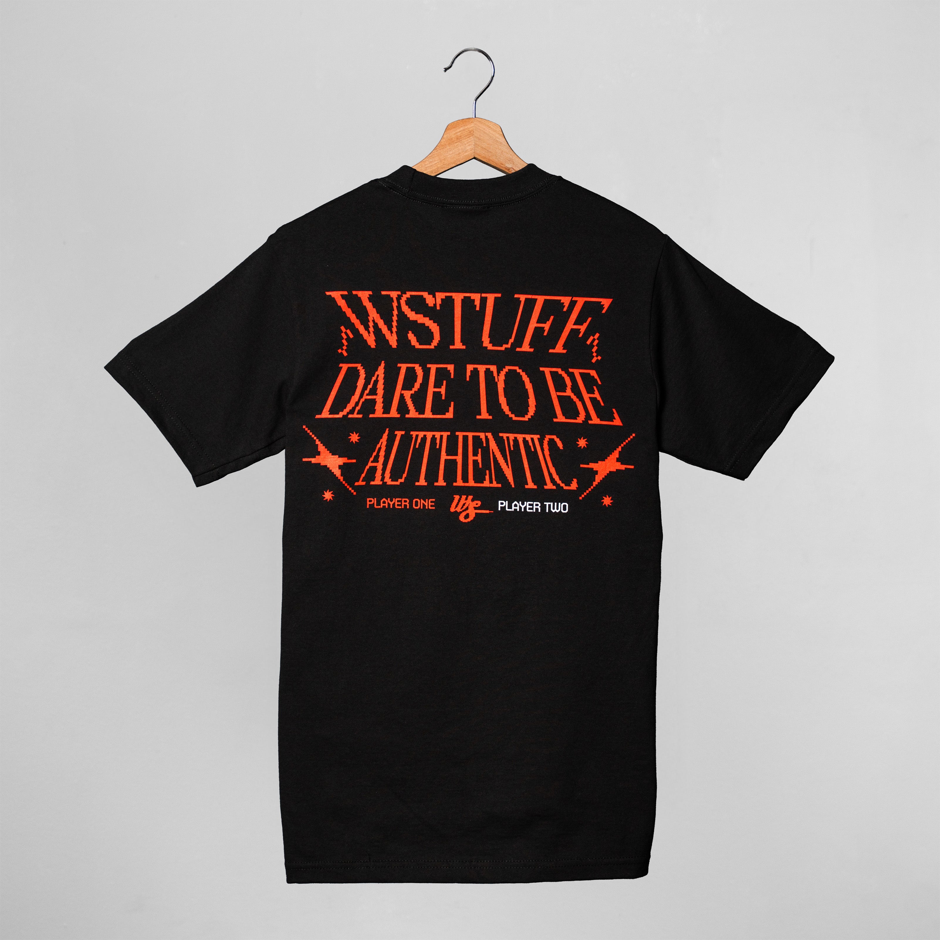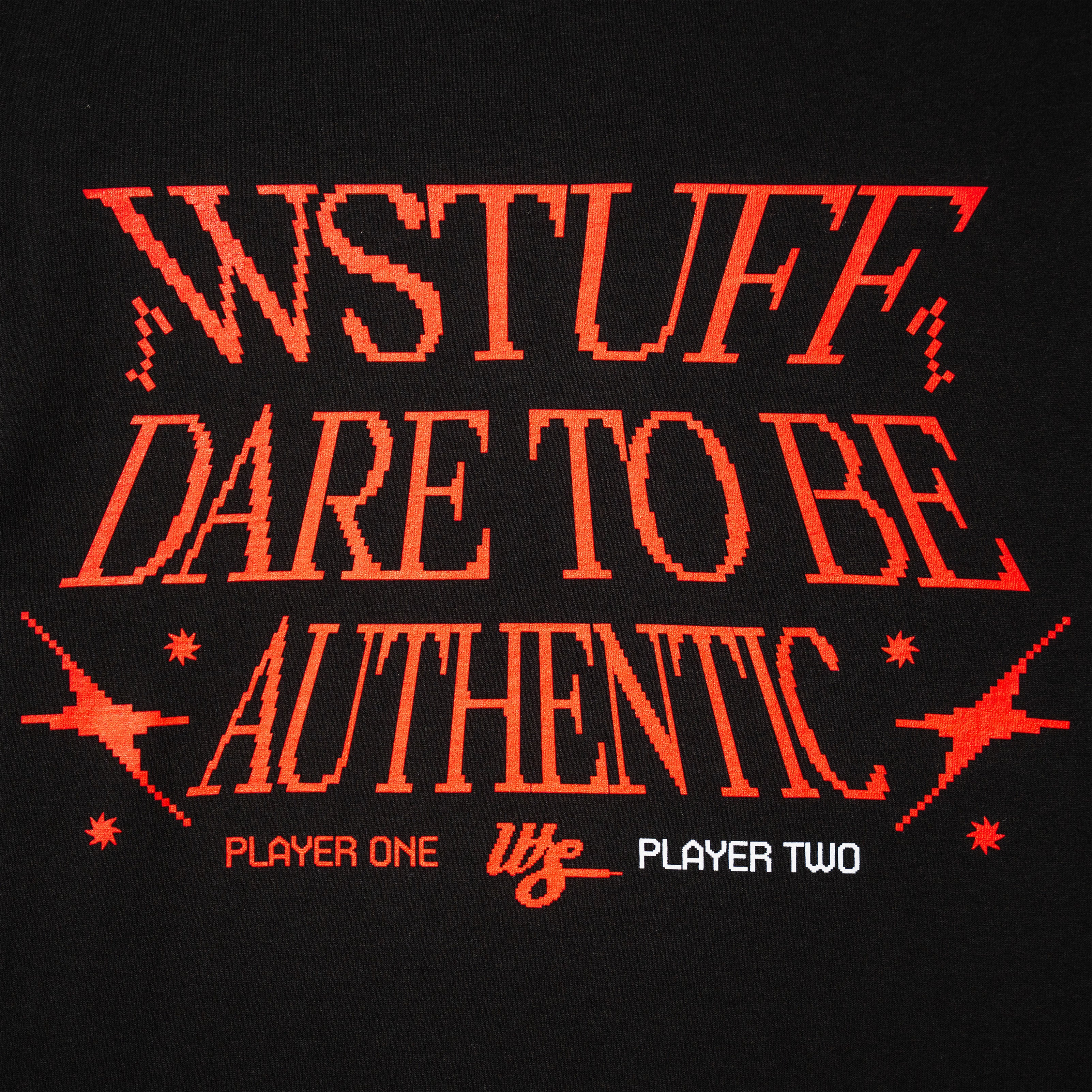 Inspired by classic arcade culture, this design translates the WS identity into a pixel-driven visual language reminiscent of vintage game screens. The artwork blends retro gaming aesthetics with WSTUFF’s modern streetwear presence, featuring a pixelated WS logo on the front and “Dare to Be Authentic” on the back. Each colorway represents a role in the game: Player One (blue), Player Two (red), and the CPU (white), all running the same code — Authenticity.