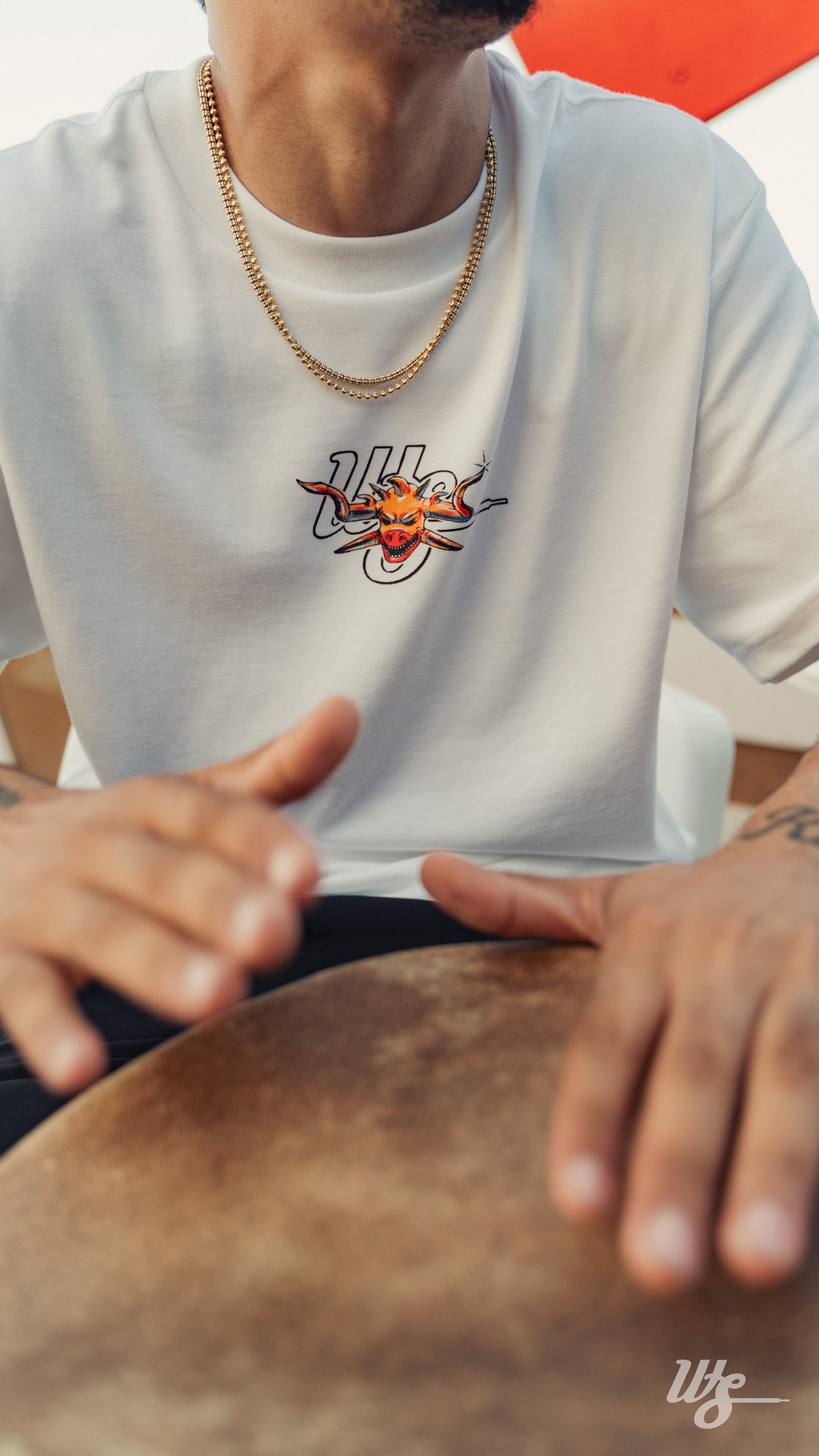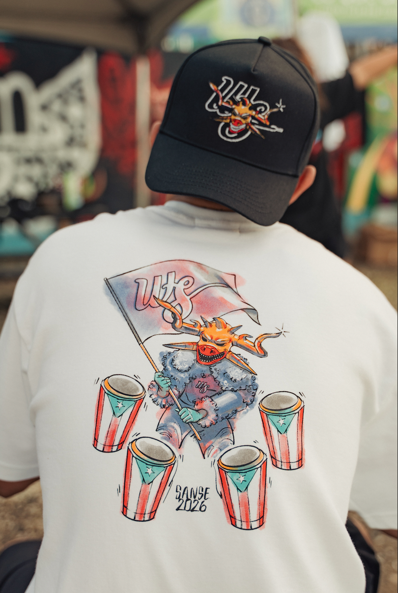 "Capturing the rhythm, color, and energy of Las Calles de San Sebastián. Rooted in Puerto Rican tradition and inspired by the cultural outfits seen in parades and bomba y plena performances, the design blends heritage with contemporary streetwear for a piece that stands out with intention and pride."