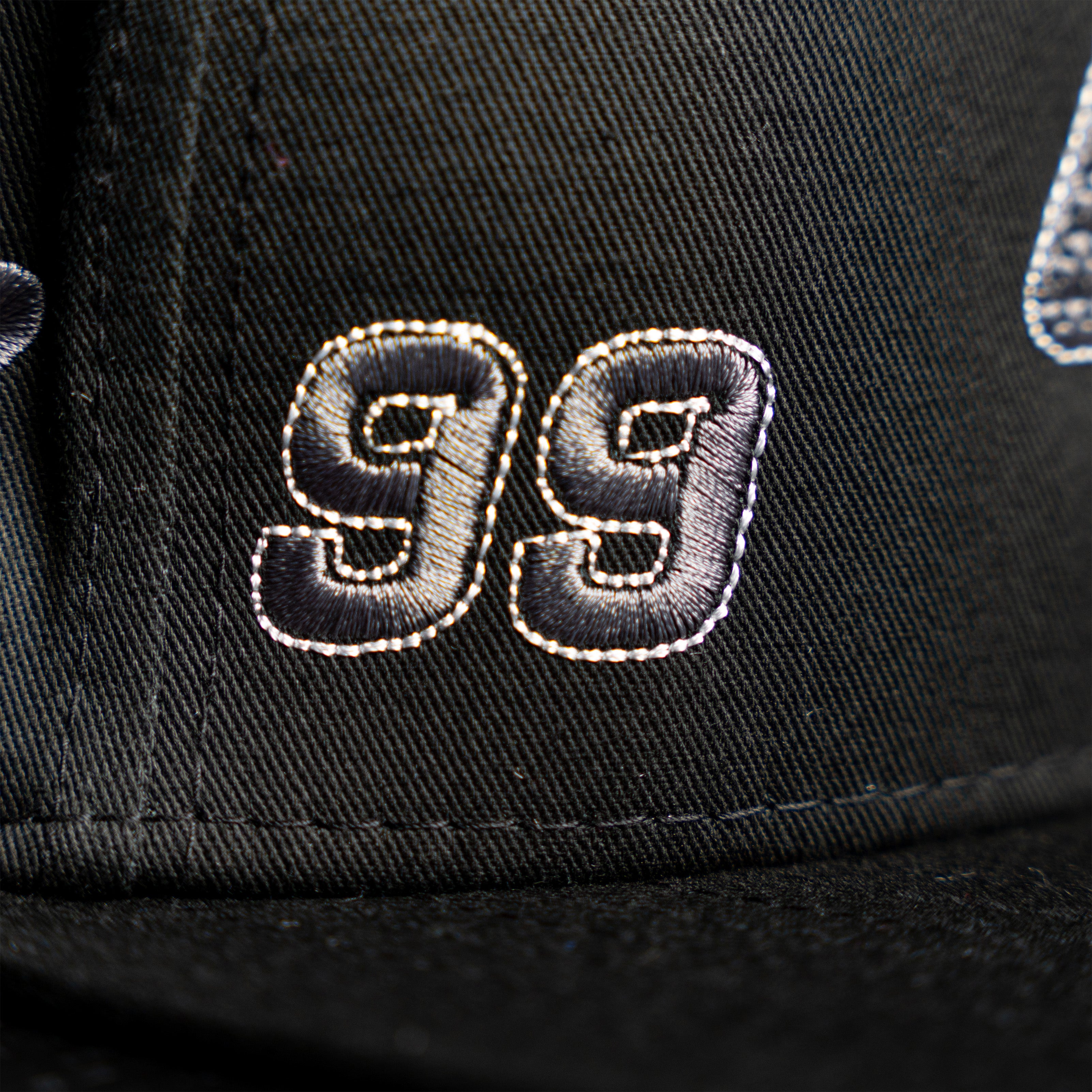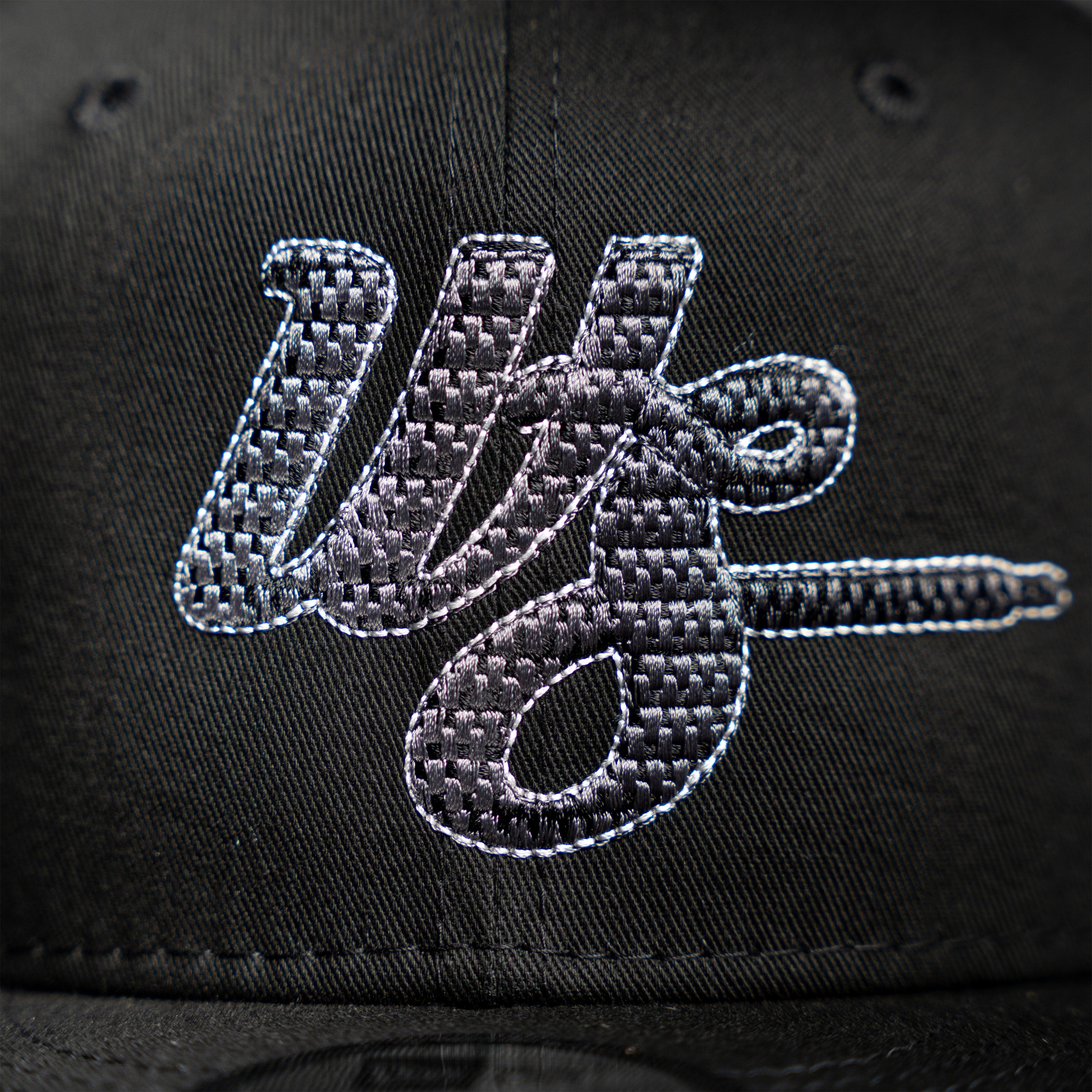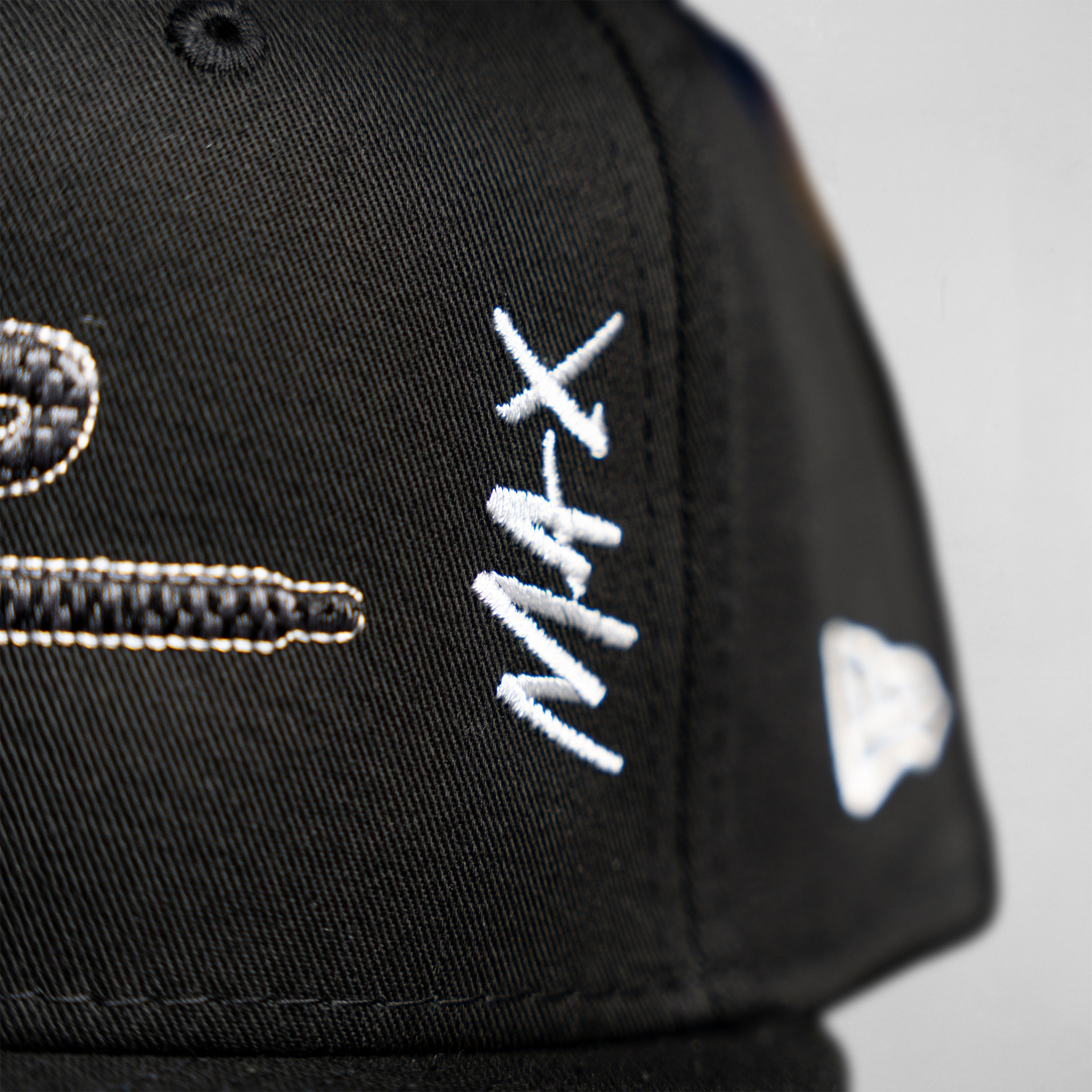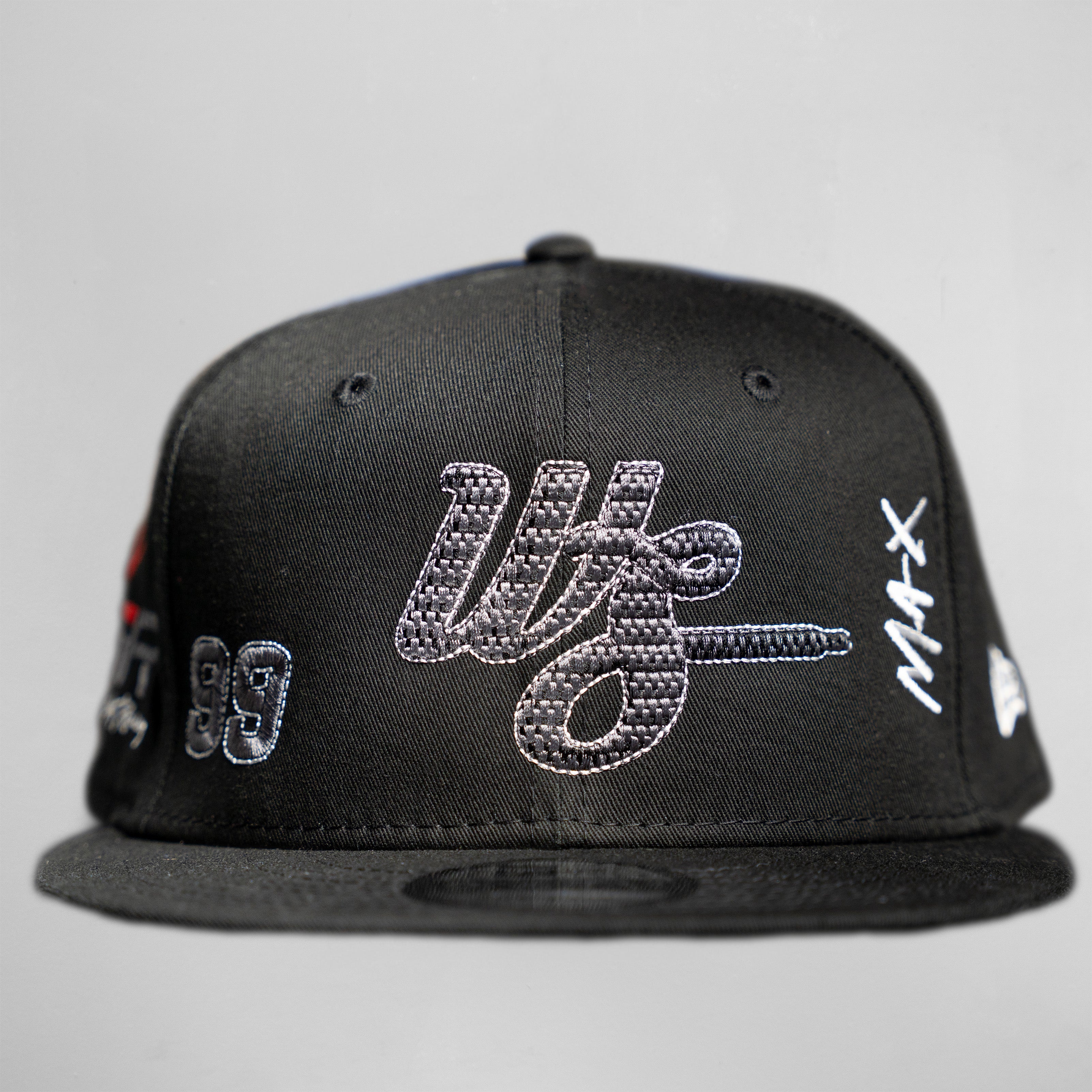 New Era snapback featuring a raised WS logo with a tonal black and grey finish inspired by performance materials, such as carbon fiber. The textured embroidery mimics the layered, lightweight feel associated with high-speed engineering, adding depth without being loud. Side details include the "99" mark and collaborative accents tied to the VGR project. Developed as part of the Wilson's Stuff × Victor Gonzalez collaboration, this piece connects technical influence with everyday wear.