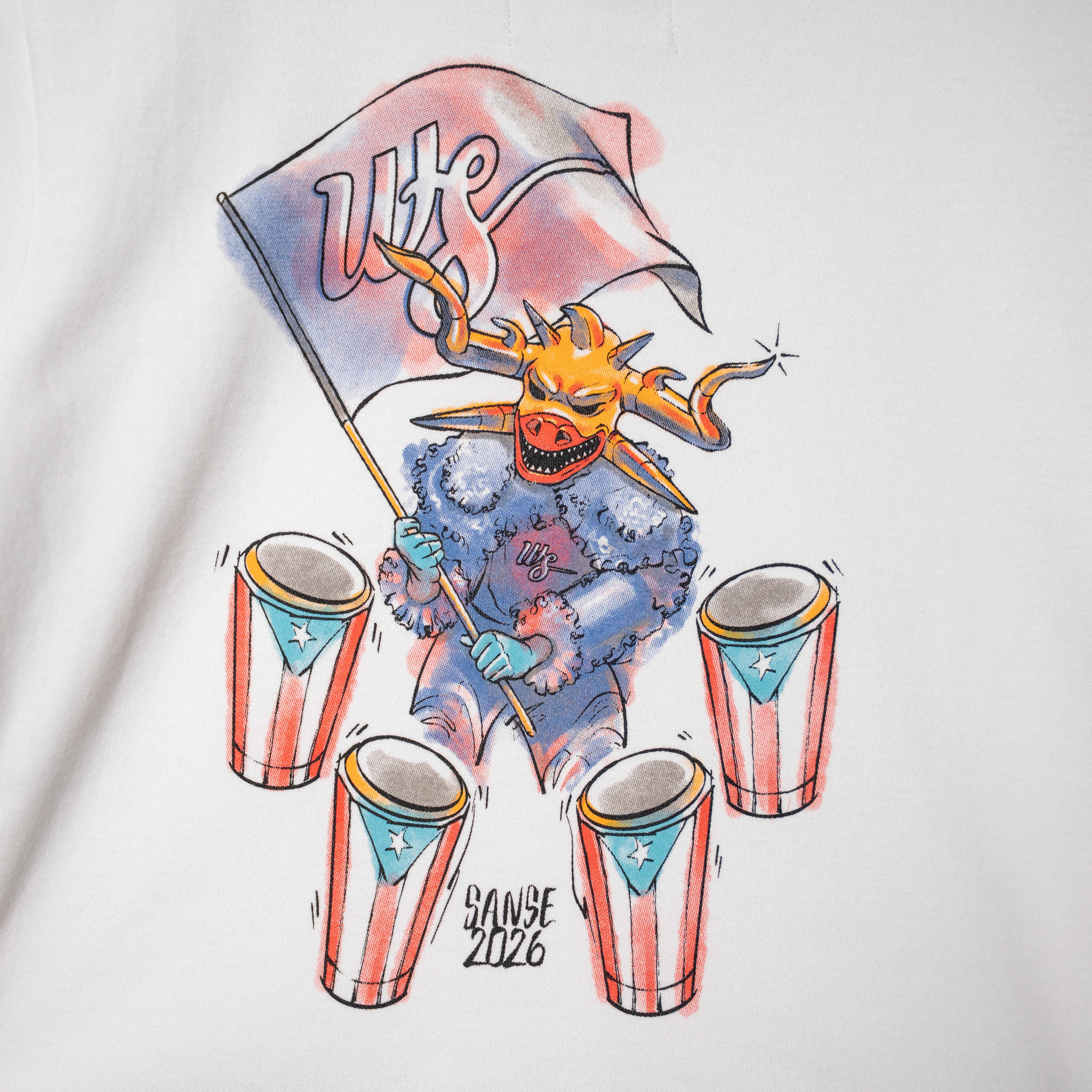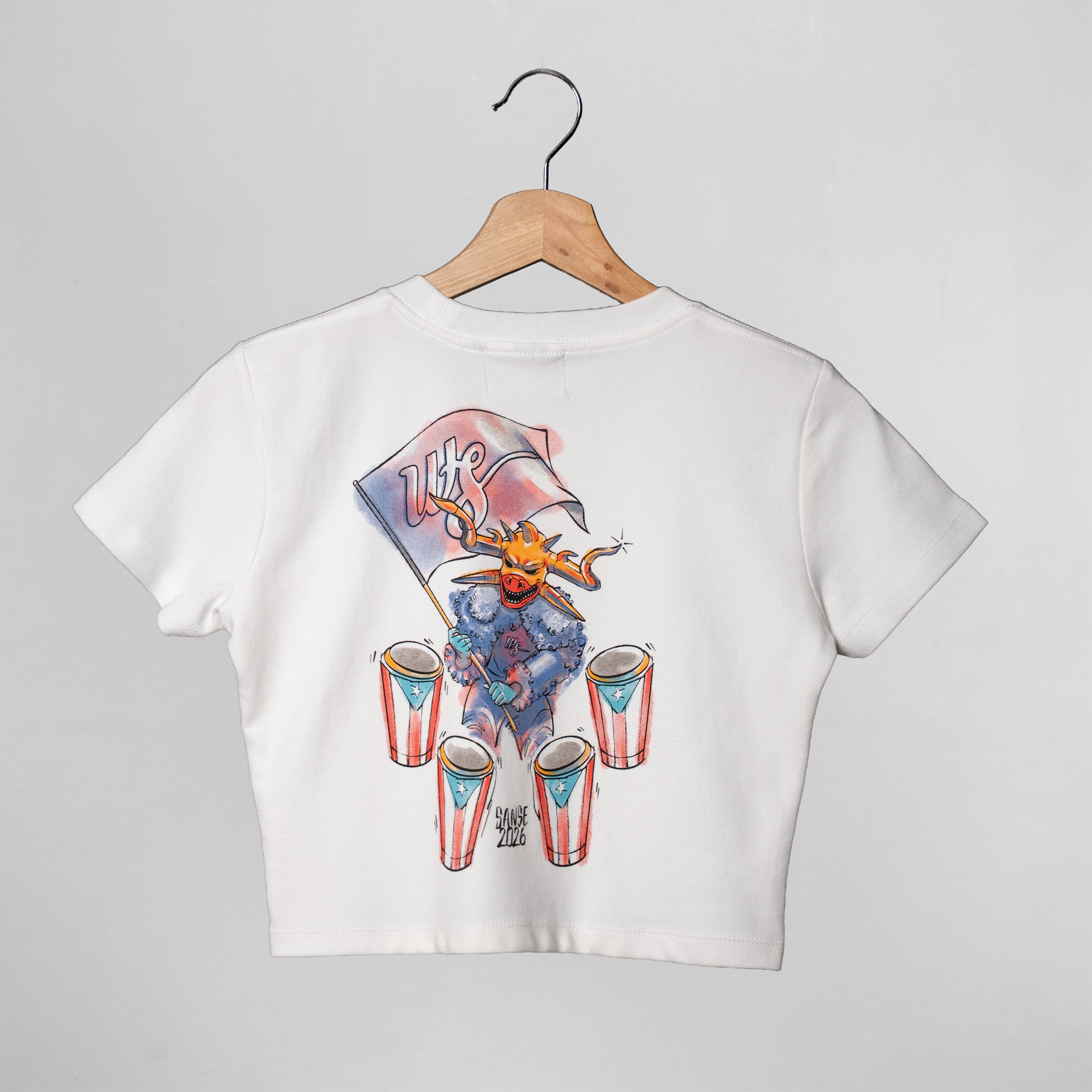 "Capturing the rhythm, color, and energy of Las Calles de San Sebastián. Rooted in Puerto Rican tradition and inspired by the cultural outfits seen in parades and bomba y plena performances, the design blends heritage with contemporary streetwear for a piece that stands out with intention and pride."