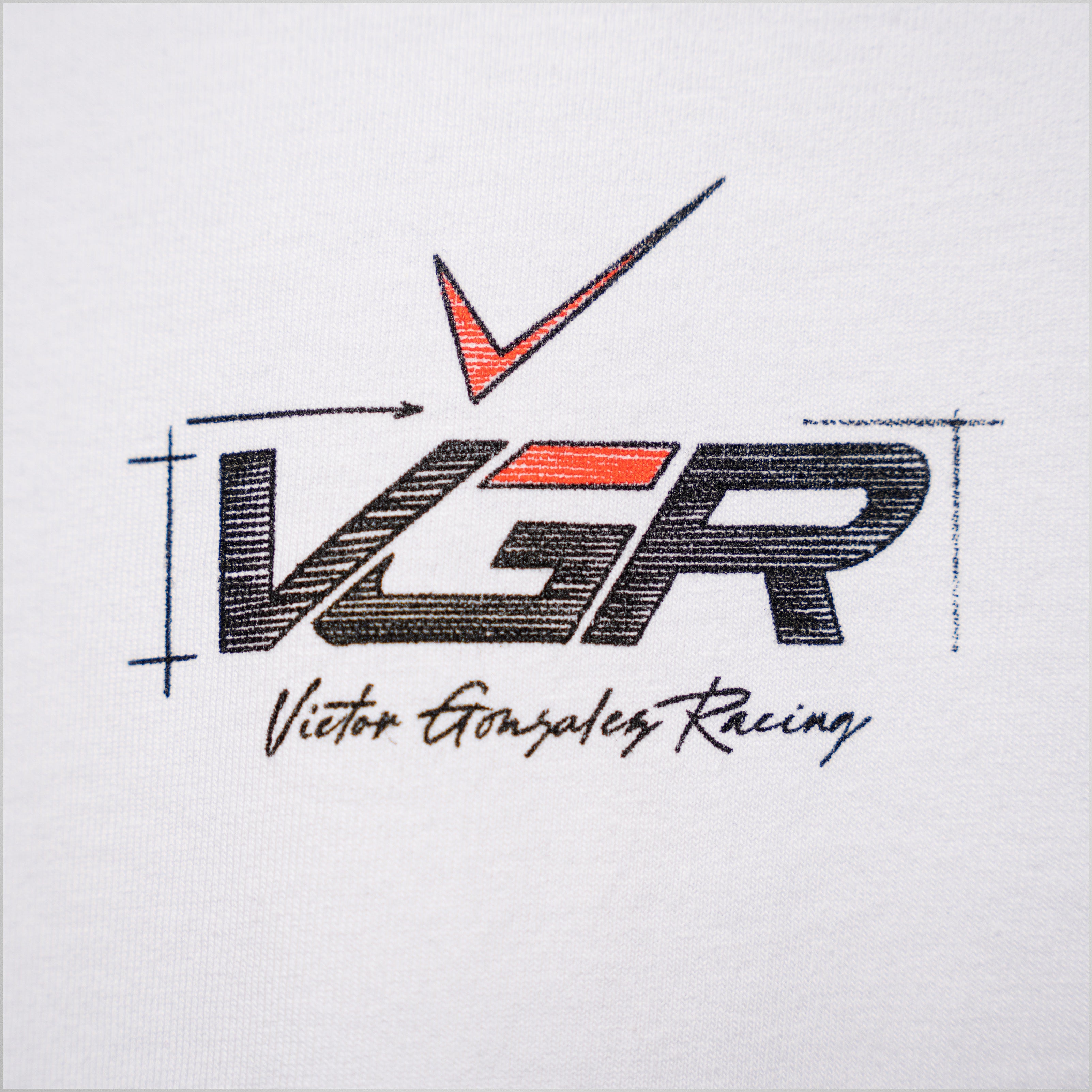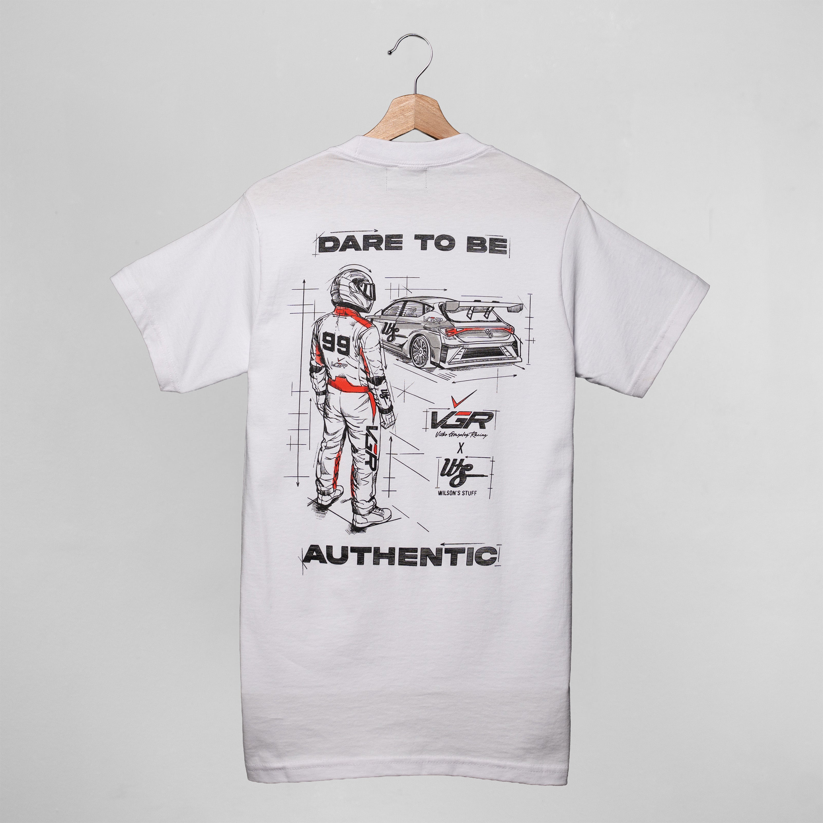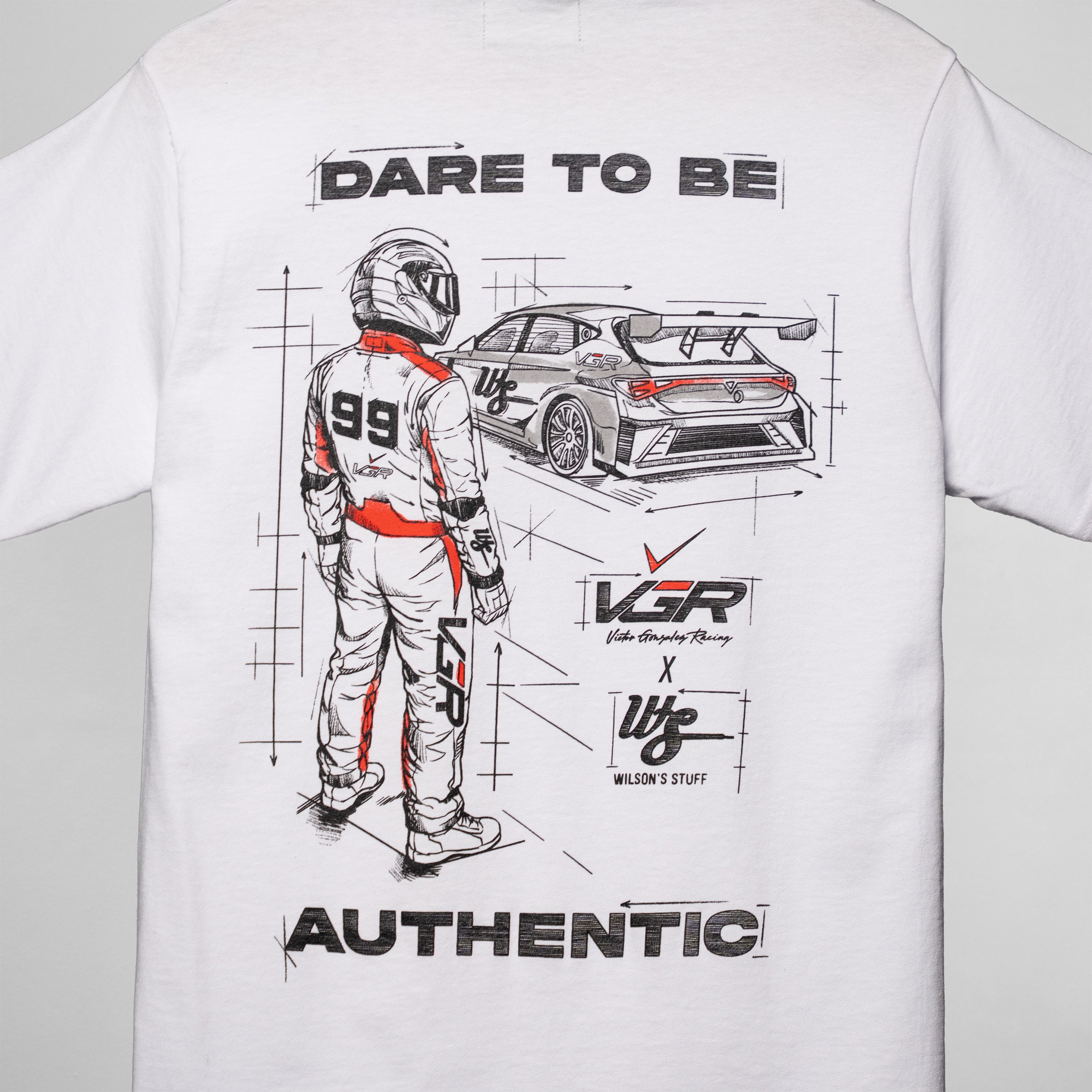 Designed around the visual language of the motorsport track, this piece combines technical sketch artwork with performance-driven detailing. The back features a driver-and-machine composition inspired by race engineering, while the front carries a clean VGR chest mark for balance. Part of Wilson's Stuff's first professional racing collaboration with Puerto Rican driver Victor Gonzalez